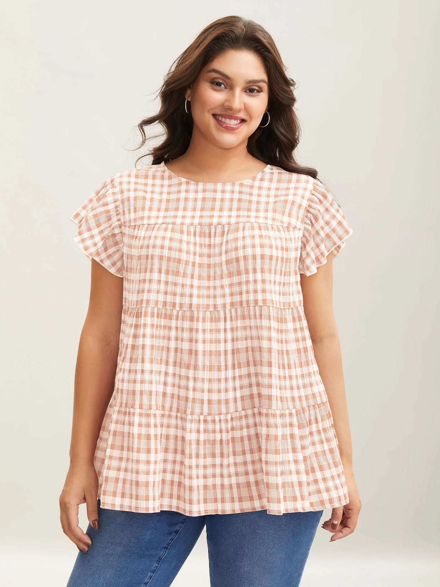 Plaid Print Textured Lotus Leaf Sleeve Shirt