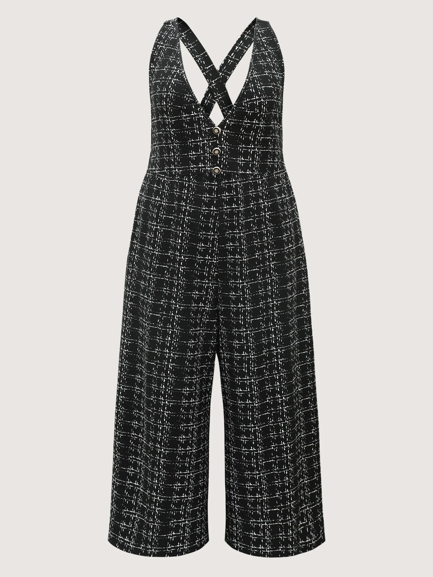 Plaid Tweed Crisscross Back Button Detail Jumpsuit