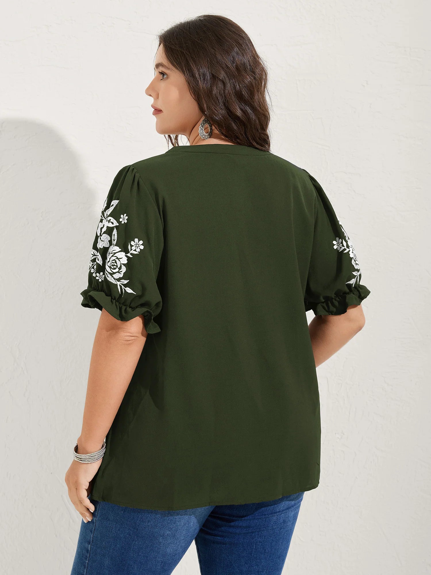 Notched Collar Embroidered Ruffled Blouse